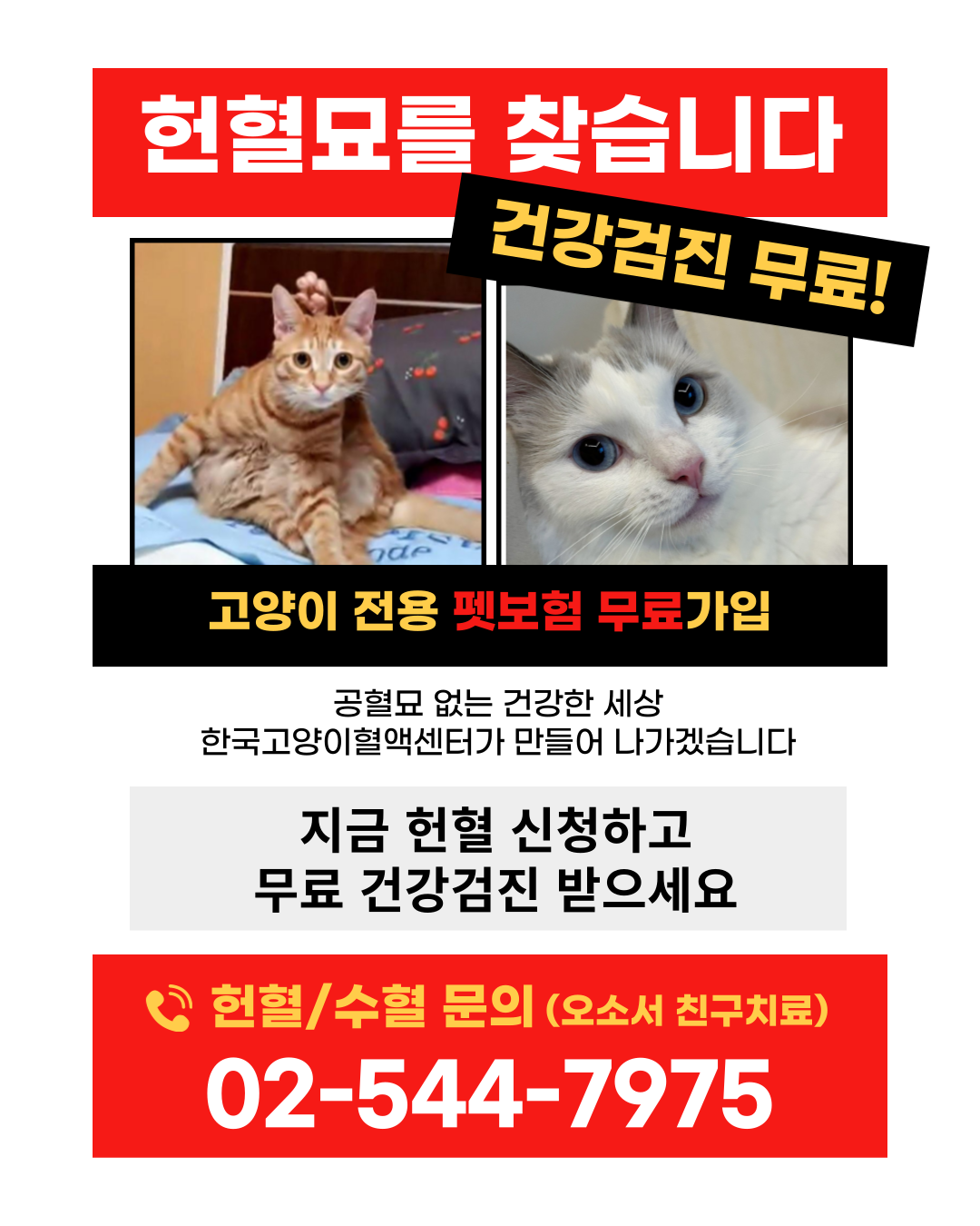 지금 바로 하단의 신청 버튼을 눌러 한국고양이혈액센터에서 진행하는 고양이 헌혈캠페인을 신청하세요!